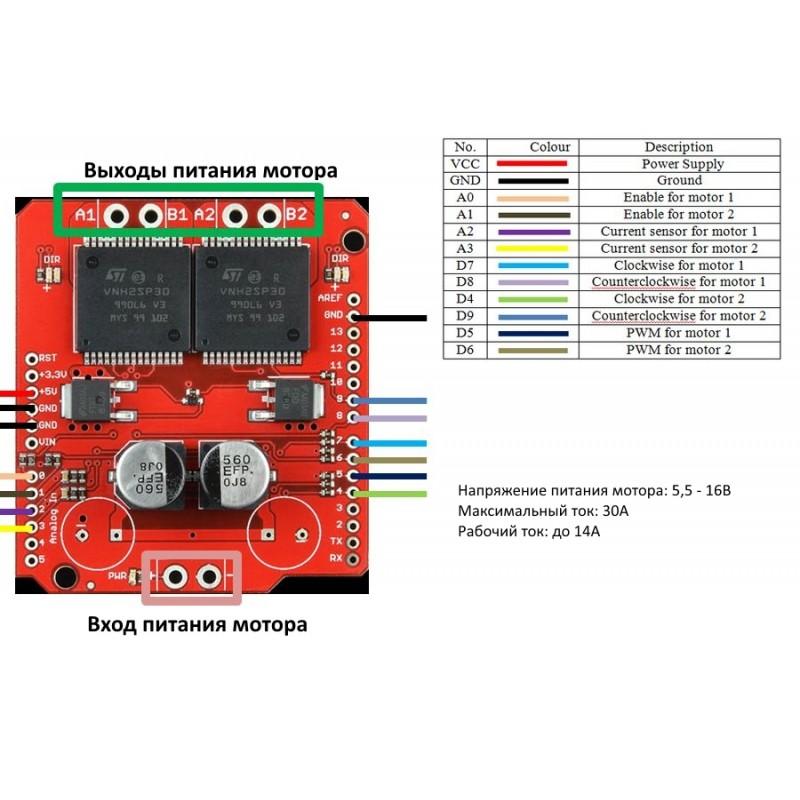 Микросхема VNH2SP30, на которой основан модуль, имеет ряд преимуществ, по сравнению с конкурентами. Кроме высоких показателей пропускаемого тока, модуль имеет защиту от перегрева, защиту от перенапряжения, и защиту по току, что делает модуль гораздо надежнее. Тем не менее, при высоких нагрузках рекомендуется ставить на микросхему радиатор, или даже небольшой кулер.